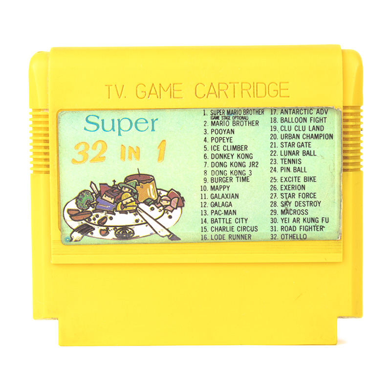 32 в 1: Super Mario, Mario Bros, Pooyan, Popeye, Ice Climber, Donkey Kong 1, Donkey Kong 2, Donkey Kong 3, Burger Time, Mappy, Galaxian, Galaga, Pac-Man, Battle City, Circus Charlie, Lode Runner, Antarctic Adventure, Balloon Fight, Clu Clu Land, Urban Champion, Star Gate, Lunar Ball, Tennis, Pinball, Excite Bike, Exerion, Star Force, Sky Destroyer, Macross, Yie Ar Kung Fu, Road Fighter, Othello
