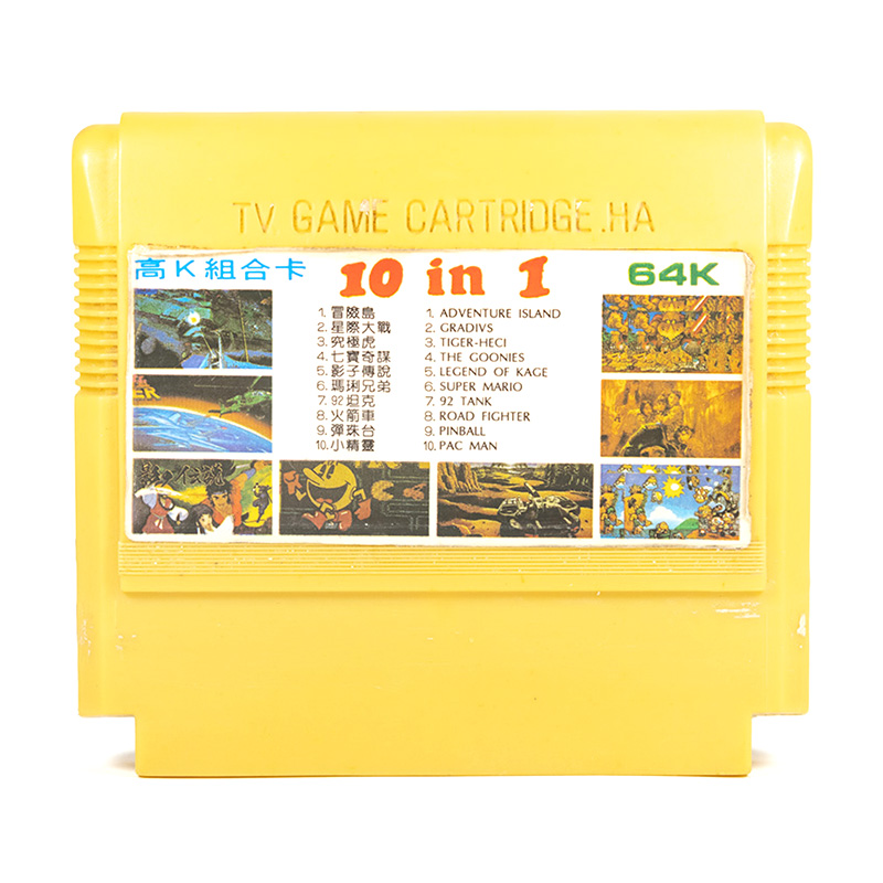 10 в 1: Adventure Island 1, Gradius, Tiger Heli, Goonies, Legend of Kage, Super Mario, Tank 1992, Road Fighter, Pinball, Pacman