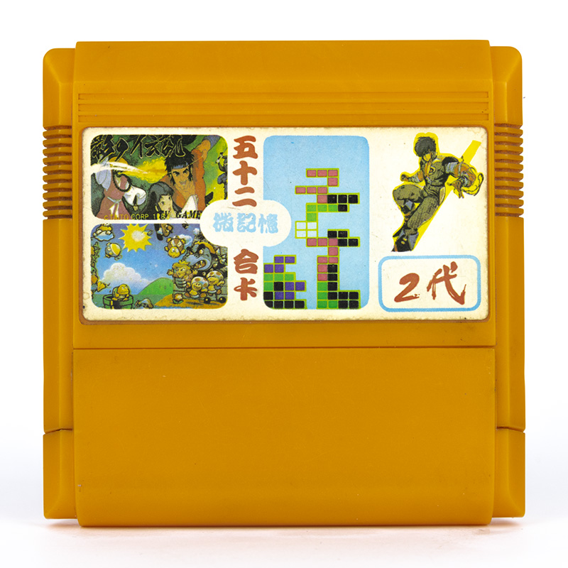 52 в 1: Adventure Island, Gradius, Northern Ken, Star Soldier, Goonies, Legend of Kage, Tetris (Tengen), Super Mario, Twin Bee, Ninja 2, City Connection, B-Wings, 1942, Gyrodine, Flappy, Spartan, Bomber Man, Front Line, Macross, Galaxian, Star Force, Yie Ar Kung Fu, Ninja 1, Mario Bros, Mahjong 2, Mahjong 4, Lode Runner 1, Lode Runner 2, Donkey Kong 1, Donkey Kong 2, Donkey Kong 3, Mappy, Excite Bike, F-1 Race, Road Fighter, Pinball, Baseball, Popeye, Galaga, Pac-Man, Ice Climber, Exerion, Wrestle, Battle City, Sky Destroyer, Gobang, Baloon Fight, Formation Z, Pooyan, Circus Charlie