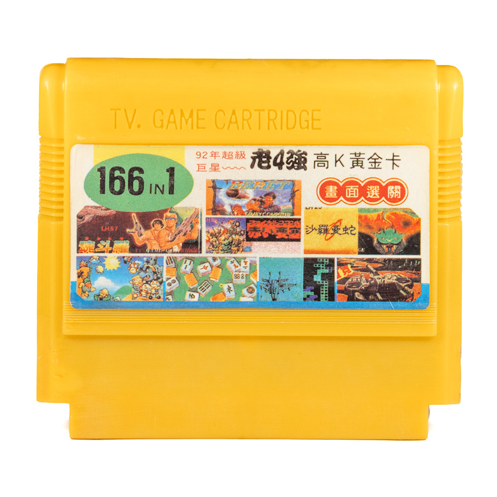 166 в 1: Contra, Life Force, Jackal, Rush'n Attack, Ninja 1, Antarctic Adventures, Binary Land, F-1 Race, Tank 1991, Sky Destroyer, Exerion, Road Fighter, Field Combat, Circus Charlie, Bomberman, Tetris 2, Star Force, Mahjong 2, Balloon Fight, Ice Climber