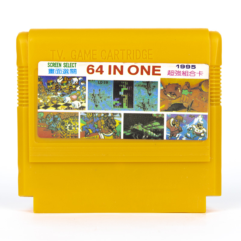 64 в 1: Adventure Island, Gradius, Star Soldier, Goonies, Legend of Kage, Tetris (Tengen), Super Mario, Twin Bee, Ninja Jajamaru-kun, City Connection, B-Wings, 1942, Spartan, Bomber Man, Front Line, Lunar Ball, Golf, Baseball, Pinball, Gobang, Lode Runner 1, Lode Runner 2, Mahjong 2, Mahjong 4, Nuts and Milk, Macross, Star Force, Yie Ar Kung Fu, Ninja-kun: Majou no Bouken, Mario Bros, Donkey Kong 1, Donkey Kong 2, Donkey Kong 3, Mappy, Excite Bike, F-1 Race, Road Fighter, Popeye, Galaga, Pac-Man, Galaxian, Ice Climber, Exerion, Wrestle, Battle City, Sky Destroyer, Baloon Fight, Formation Z, Pooyan, Circus Charlie, Karateka, Arabian, Antarctic Adventure