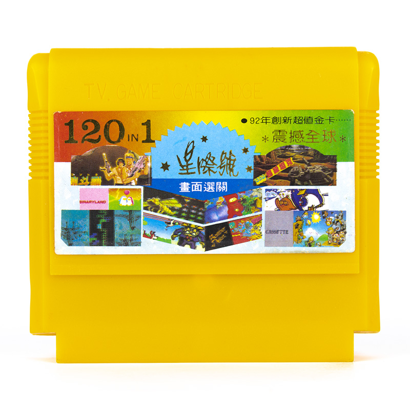 120 в 1: Contra, Tetris 2, B-Wings, Tank 1991, Super Mario 1, Duck Hunt, Antarctic Adventure, Dig Dug, Binary Land, Galaxian, Ice Climber, Bomberman, Road Fighter, Ninja 1