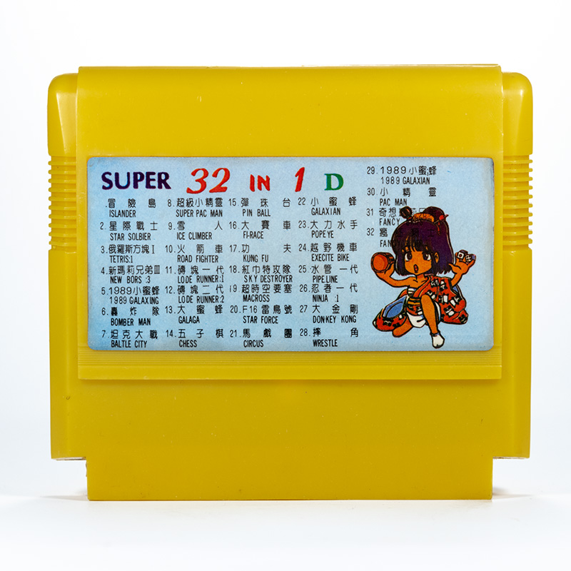 32 в 1: Adventure Island 1, Star Soldier, Tetris (Tengen), Super Mario, Galaxian, Bomberman, Battle City, Pacman, Ice Climber, Road Fighter, Lode Runner 1, Lode Runner 2, Galaga, Chinese Chess, Pinball, F-1 Race, Kung-Fu, Sky Destroyer, Macross, Star Force, Circus Charlie, Popeye, Excite Bike, Mario Bros, Ikki, Donkey Kong, Wrestle, Exerion