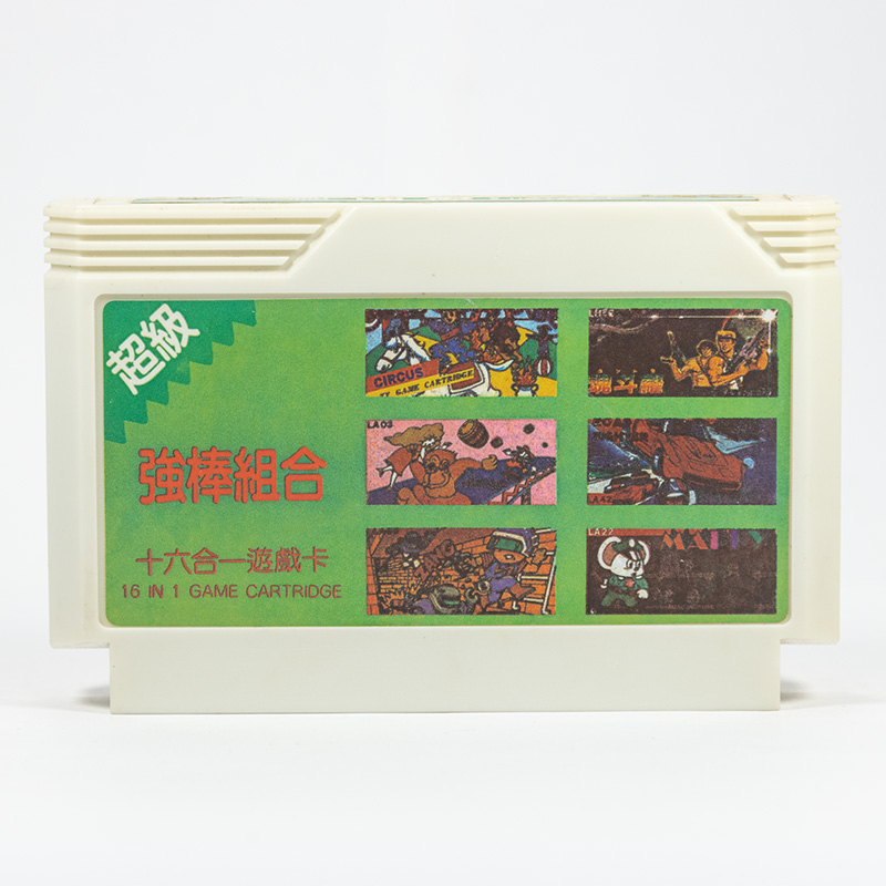 16 в 1: Contra, Super Mario, Lunar Ball, Macross, Road Fighter, Excite Bike, Circus Charlie, Devil World, Clu Clu Land, Donkey Kong, Lode Runner 1, Lode Runner 2, Mappy, Mario Bros, Space Invaders, Milk Nuts