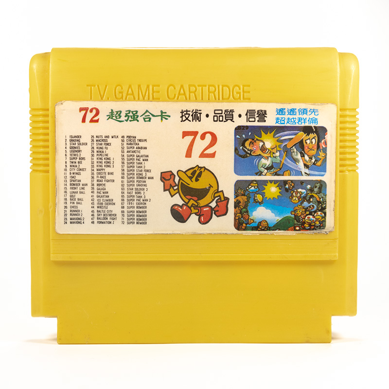 72 в 1: Adventure Island, Gradius, Star Soldier, Goonies, Legend of Kage, Tetris (Tengen), Super Mario, Twin Bee, Ninja Jajamaru-kun, City Connection, B-Wings, 1942, Spartan, Bomber Man, Front Line, Lunar Ball, Golf, Baseball, Pinball, Gobang, Lode Runner 1, Lode Runner 2, Mahjong 2, Mahjong 4, Nuts and Milk, Macross, Star Force, Kung Fu, Ninja-kun: Majou no Bouken, Mario Bros, Donkey Kong 1, Donkey Kong 2, Donkey Kong 3, Mappy, Excite Bike, F-1 Race, Road Fighter, Popeye, Galaga, Pac-Man, Galaxian, Ice Climber, Exerion, Wrestle, Battle City, Sky Destroyer, Baloon Fight, Formation Z, Pooyan, Circus Charlie, Karateka, Arabian, Antarctic Adventure
