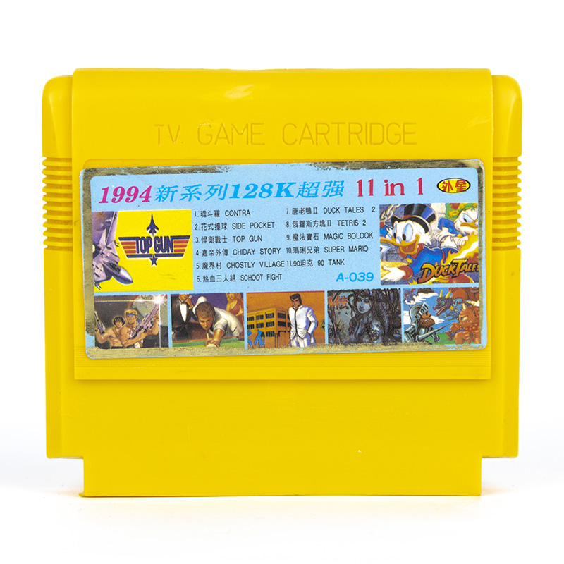 11 в 1: [A-039] Contra, Side Pocket, Top Gun 1, Chi Dey Story, Ghost'n Goblins, School Fight, DuckTales 2, Tetris 2, Jewelry, Super Mario, Tank 1990