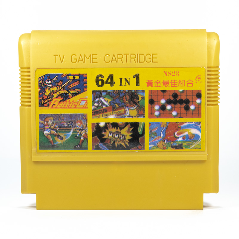 64 в 1: [NS23] Adventure Island, Gradius, Star Soldier, Goonies, Legend of Kage, Tetris (Tengen), Super Mario, Twin Bee, Ninja Jajamaru-kun, City Connection, B-Wings, 1942, Spartan, Bomber Man, Front Line, Lunar Ball, Golf, Baseball, Pinball, Gobang, Lode Runner 1, Lode Runner 2, Mahjong 2, Mahjong 4, Nuts and Milk, Macross, Star Force, Yie Ar Kung Fu, Ninja-kun: Majou no Bouken, Mario Bros, Donkey Kong 1, Donkey Kong 2, Donkey Kong 3, Mappy, Excite Bike, F-1 Race, Road Fighter, Popeye, Galaga, Pac-Man, Galaxian, Ice Climber, Exerion, Wrestle, Battle City, Sky Destroyer, Baloon Fight, Formation Z, Pooyan, Circus Charlie, Karateka, Arabian, Antarctic Adventure