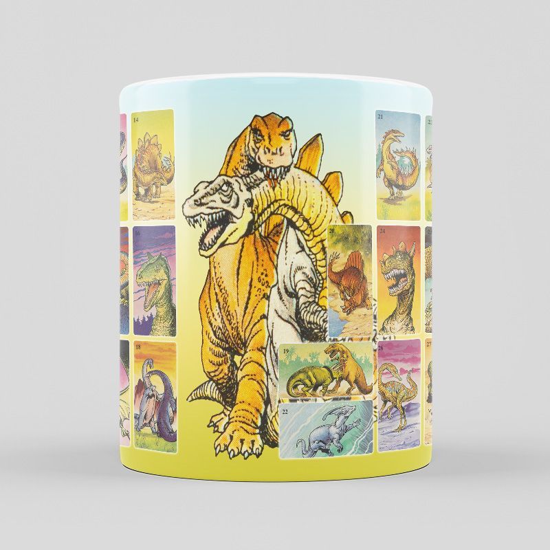 Кружка с изображением вкладышей-наклеек из жвачек Dunkin "Dinosaur Planet", продававшихся в 90-х.