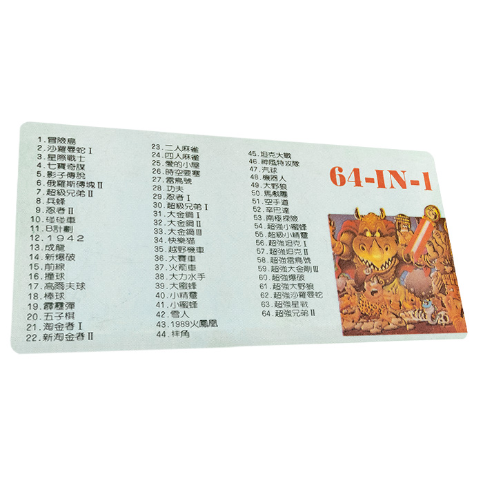 Картридж 64 в 1: Adventure Island, Gradius, Star Soldier, Goonies, Legend of Kage, Tetris (Tengen), Super Mario, Twin Bee, Ninja Jajamaru-ku